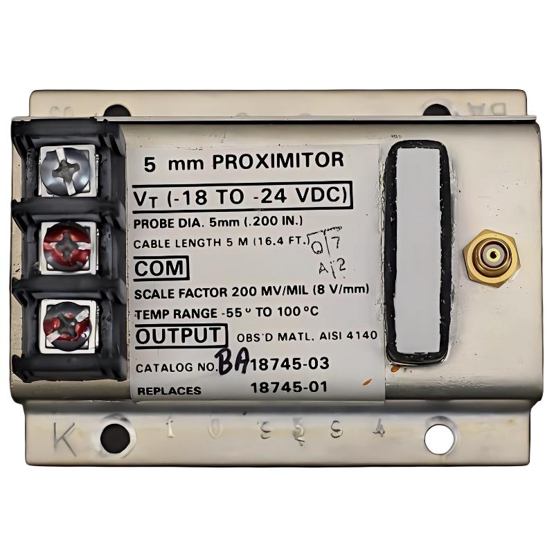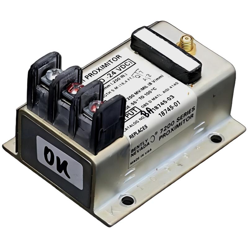 The 18745-01 preamplifier is used to condition and amplify signals from a 5mm proximity probe in the Bently Nevada 7200 system. It converts raw probe signals into stable, usable output signals for monitoring shaft vibration and position in rotating machinery.