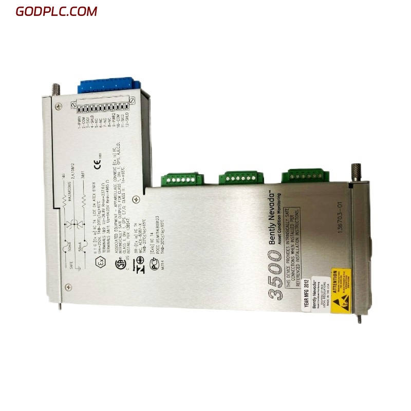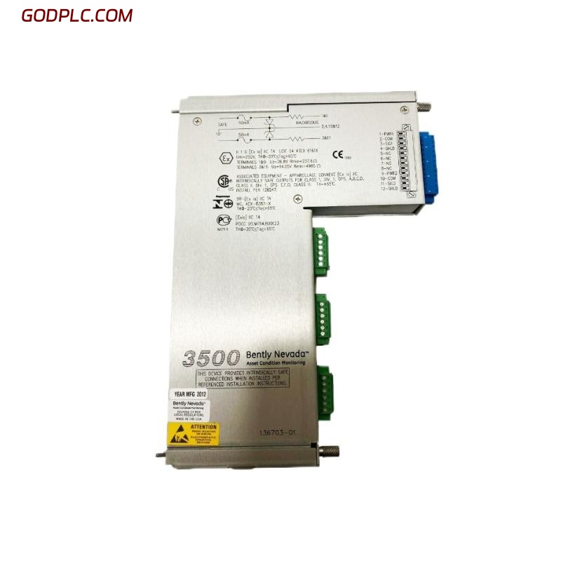 When paired with the 136703-01 Internal Barrier I/O Module, the system becomes suitable for hazardous-area applications, ensuring intrinsic safety by limiting energy transfer from the field wiring into the monitoring rack. This configuration is widely used in oil & gas, petrochemical, and power generation industries where hazardous conditions are present.